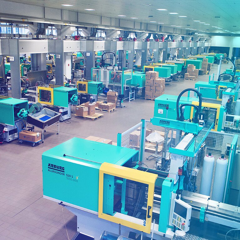 Our 55 modern injection-moulding machines, with closing forces of 50 to 220 t, are typically equipped with extraction robots and other peripherals to ensure modern and energy-efficient production. Constant quality checks per quality assurance systems according to DIN EN ISO 9001 further protect our high production standards. Thanks to the high flexibility of our manufacturing processes, we can do large and small production lots.